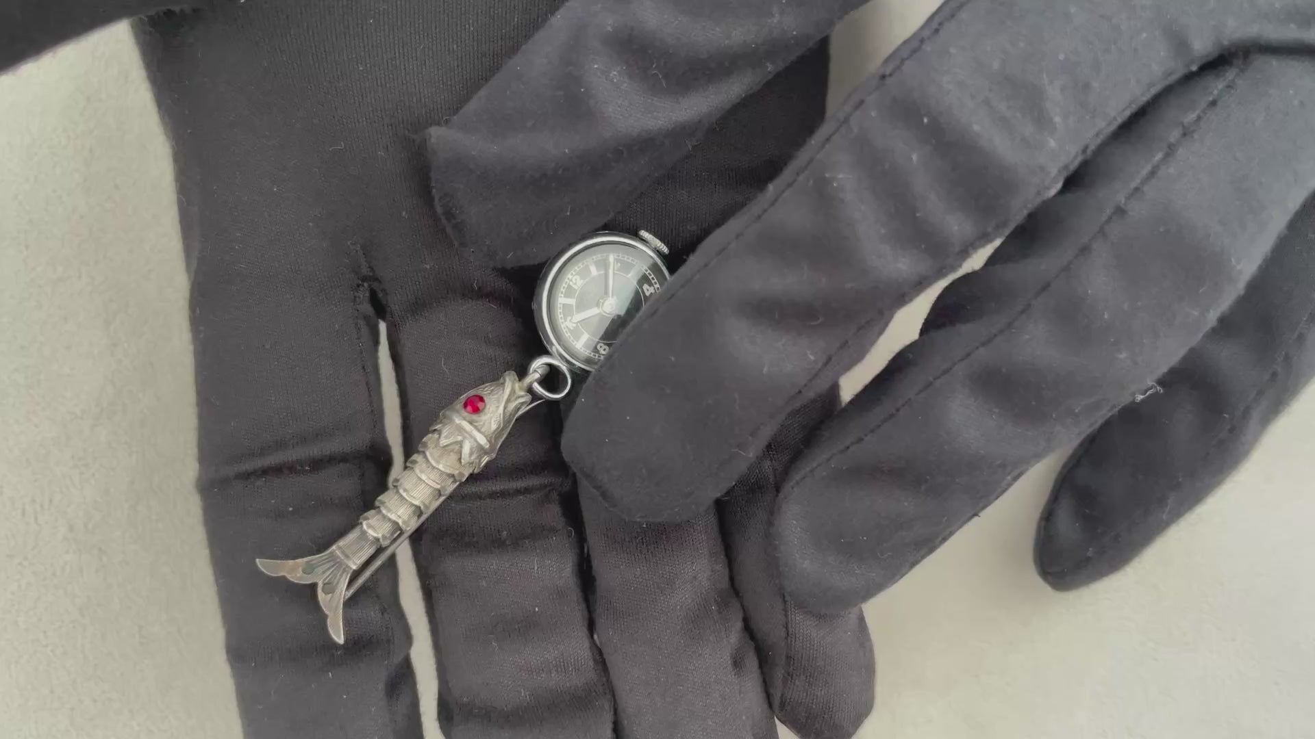 This is a pendant featuring a fish-shaped sculpture combined with a spherical watch. The fish is excellently crafted, made of multiple parts, and capable of a wave-like motion. The watch itself has a fully rounded form with glass on both sides.