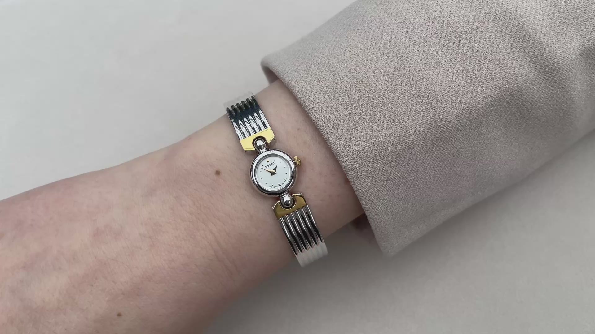 A stunning retro Seiko from 1996 that truly catches the eye. It features an unusual bracelet-like design with a tiny case in the center and a white vertically brushed dial that plays beautifully with the gold hand in the light. A real eye-catching jewel — and a rare opportunity to make it your own.